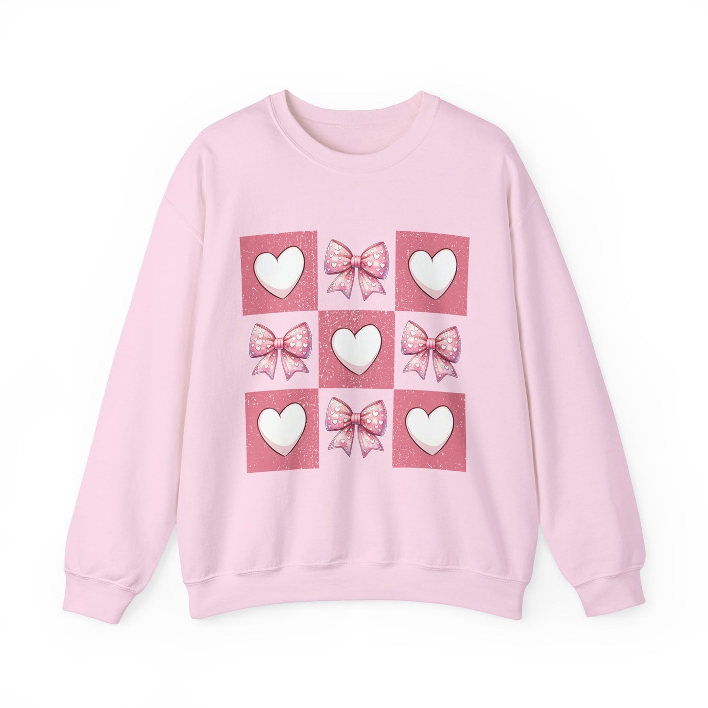 Hearts and Bows Unisex Heavy Blend Crewneck Sweatshirt, featuring a warm and cozy hearts and bow pattern design, perfect for Valentine's Day and those who appreciate a girly aesthetic. This sweatshirt is made with a medium-heavy fabric blend of 50% cotton and 50% polyester, providing comfort and durability for colder months. The classic fit and crew neckline offer a comfy wearing experience, while the double-needle stitching ensures top-tier durability. Ideal for adults seeking a cozy and stylish sweatshirt for Valentine's Day.