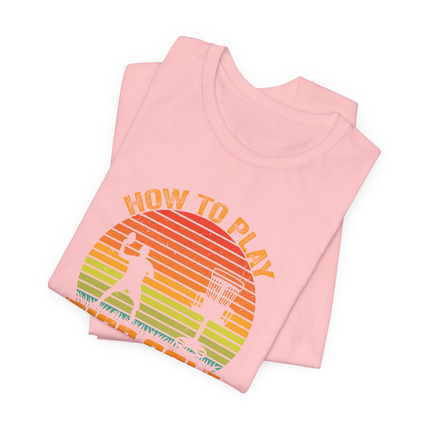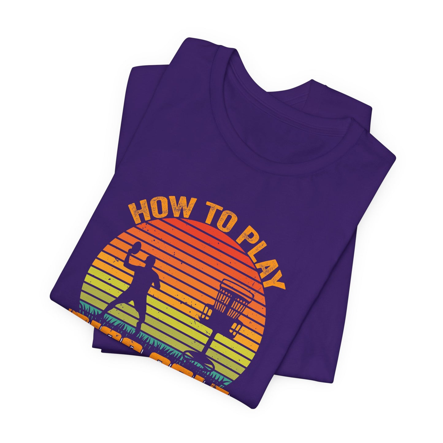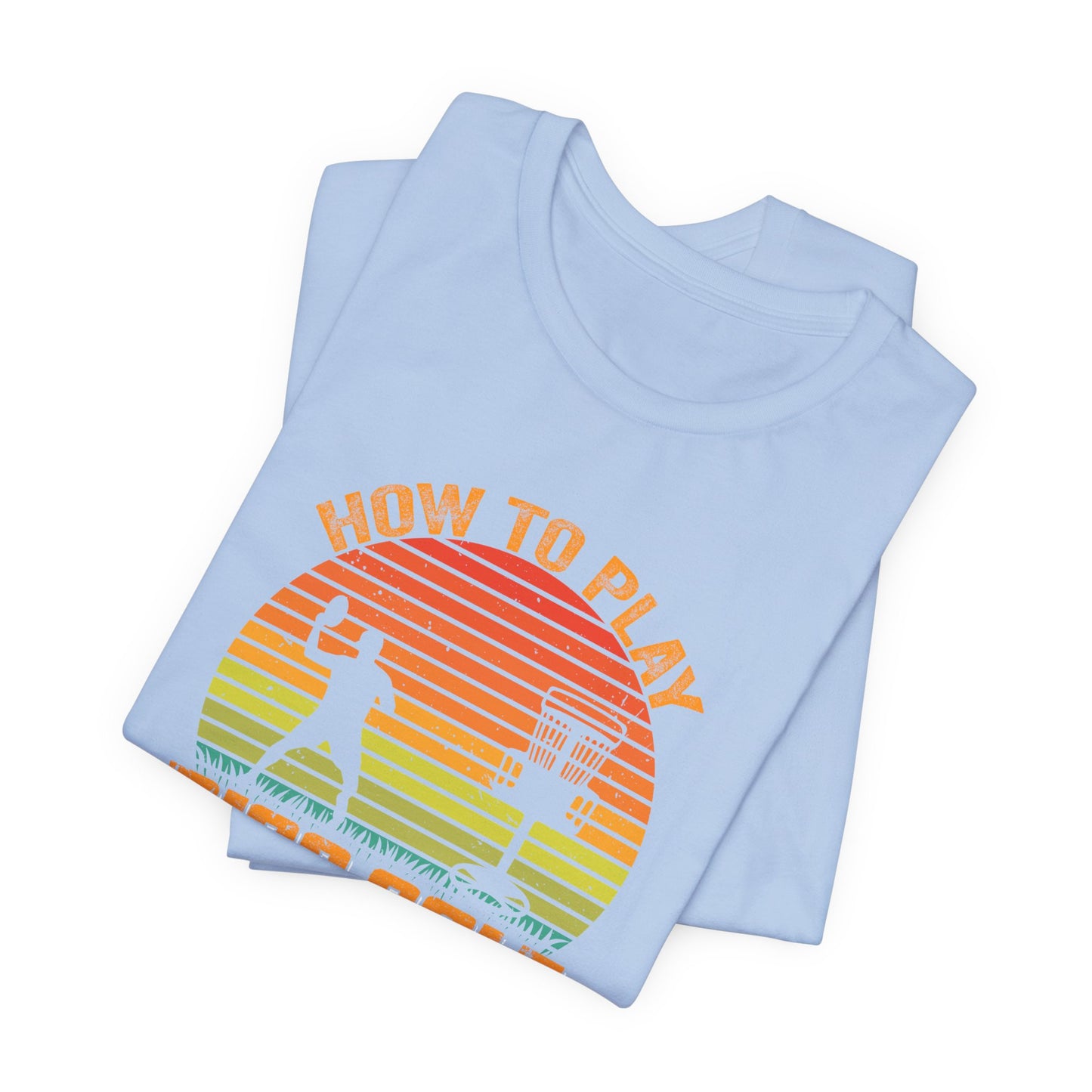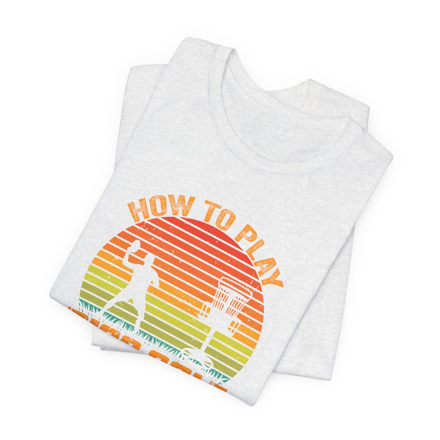 How to Play Disc Golf T-Shirt with instructions on disc golf, featuring a funny design. This T-shirt gives a casual and fun vibe, perfect for disc golf enthusiasts looking for a playful addition to their wardrobe. Great for wearing during outdoor activities and casual gatherings.