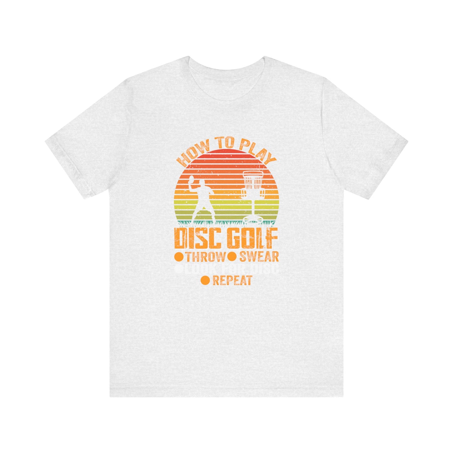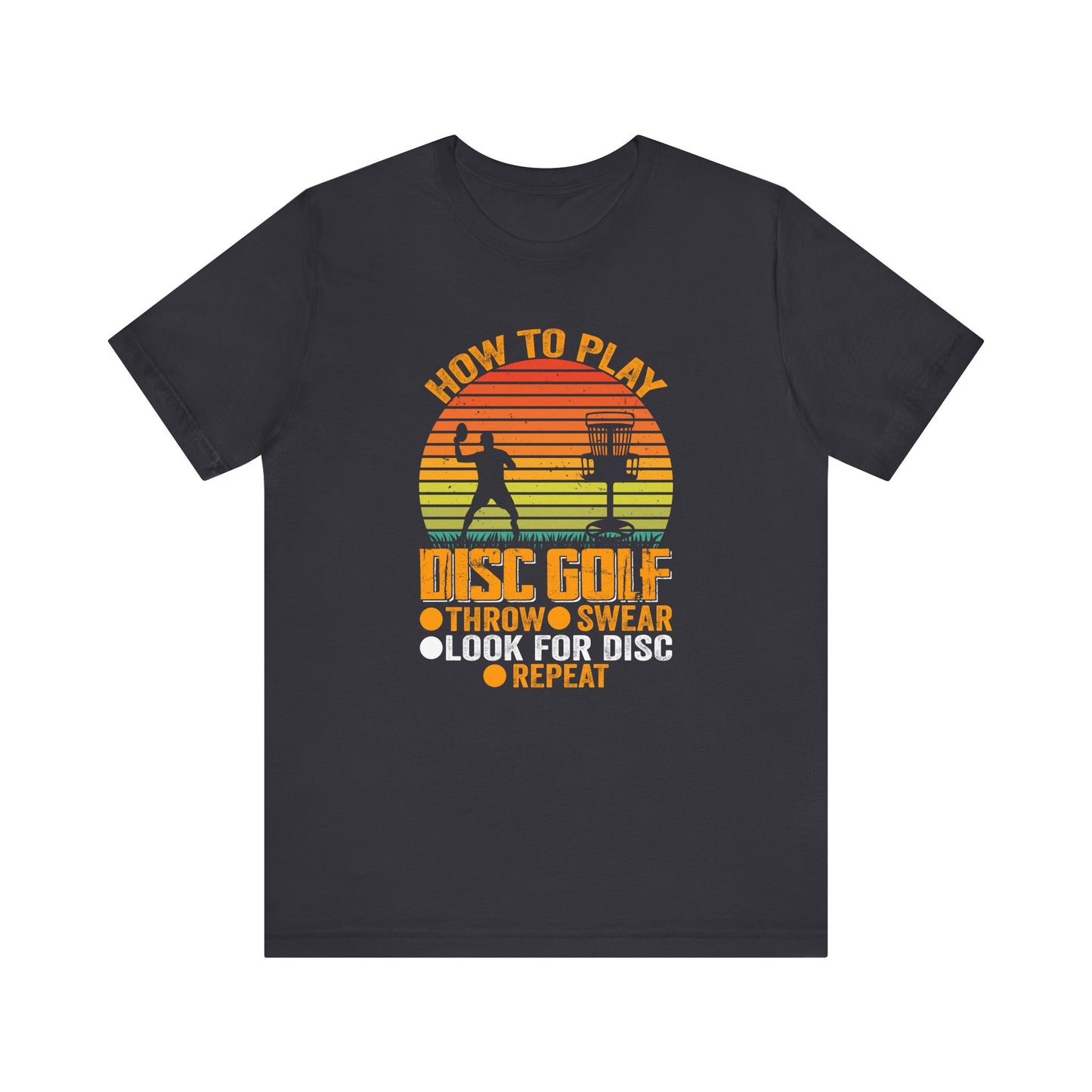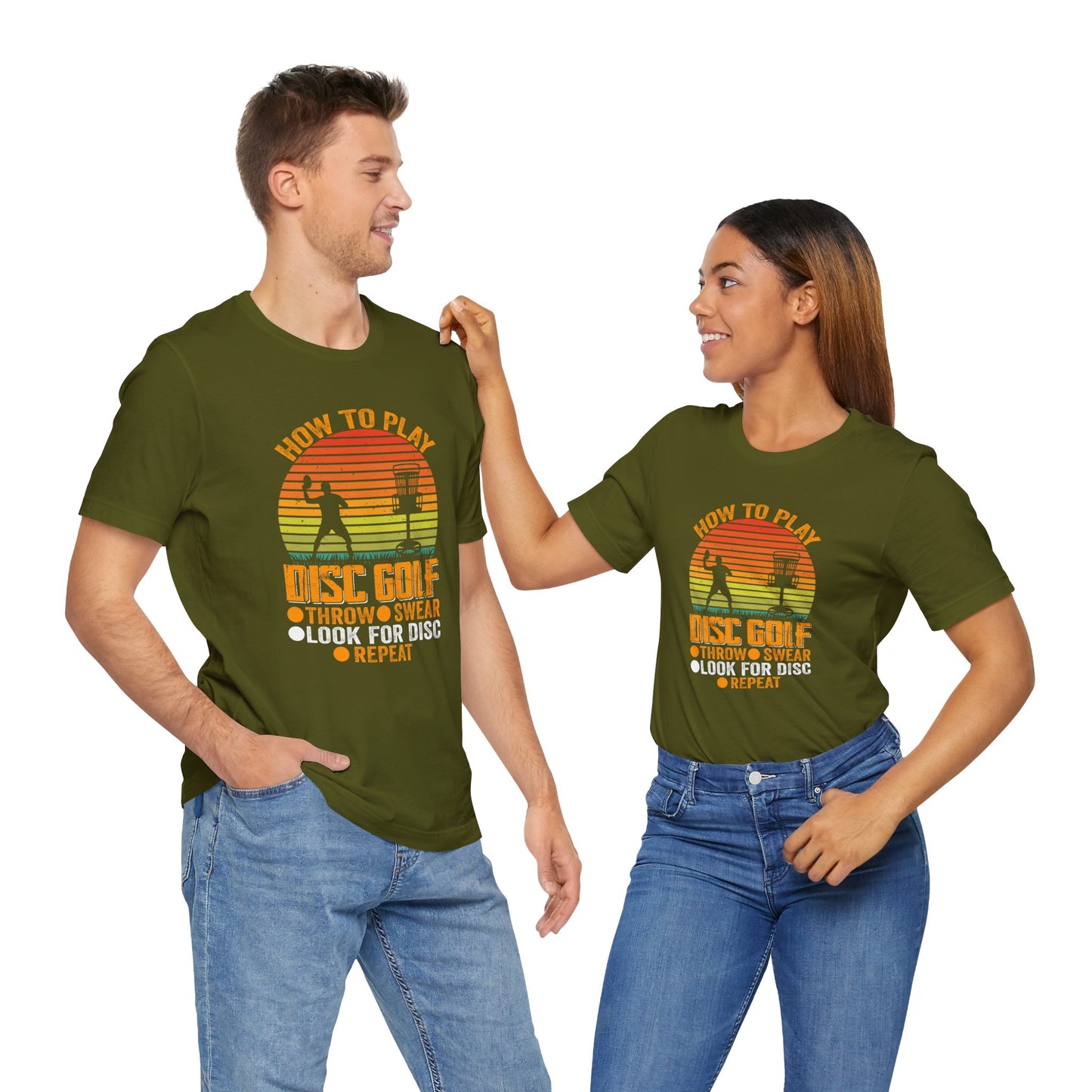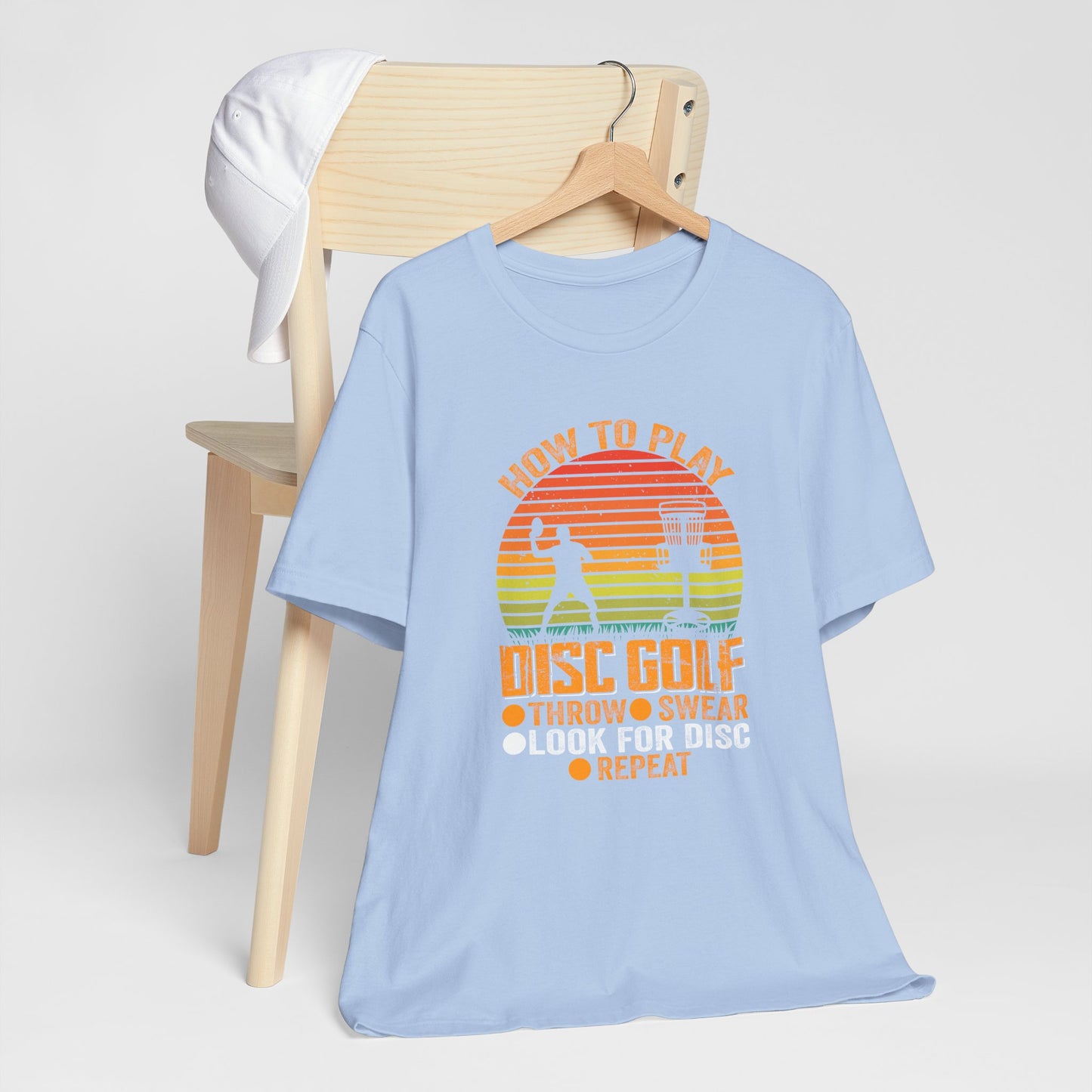 How to Play Disc Golf T-Shirt with instructions on disc golf, featuring a funny design. This T-shirt gives a casual and fun vibe, perfect for disc golf enthusiasts looking for a playful addition to their wardrobe. Great for wearing during outdoor activities and casual gatherings.