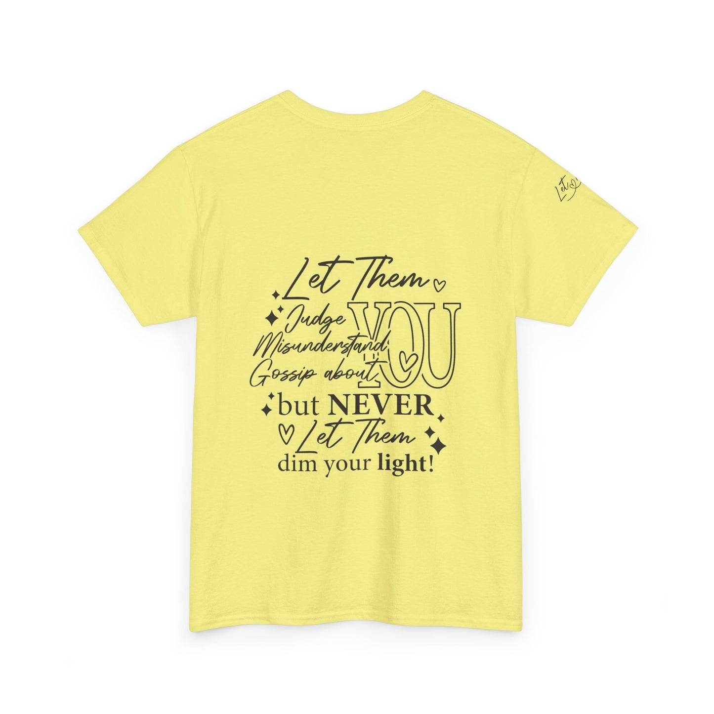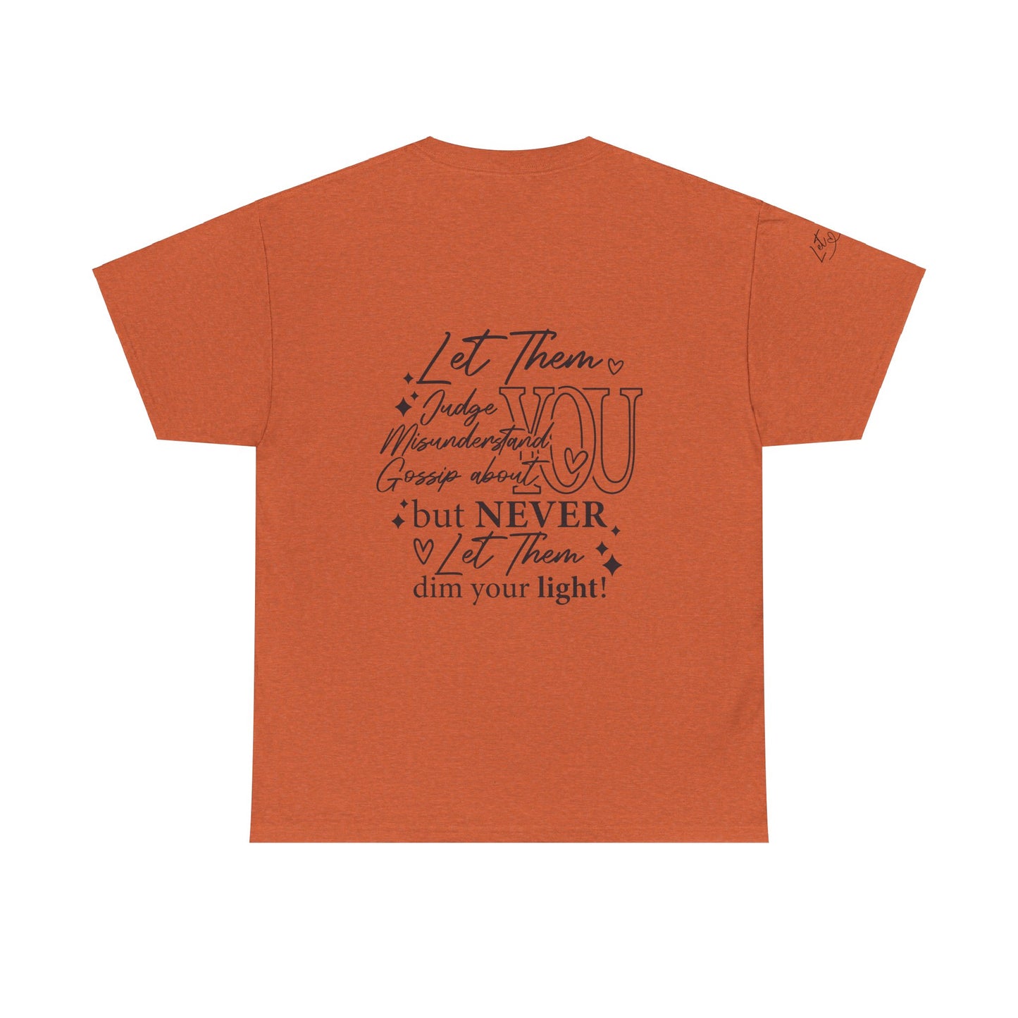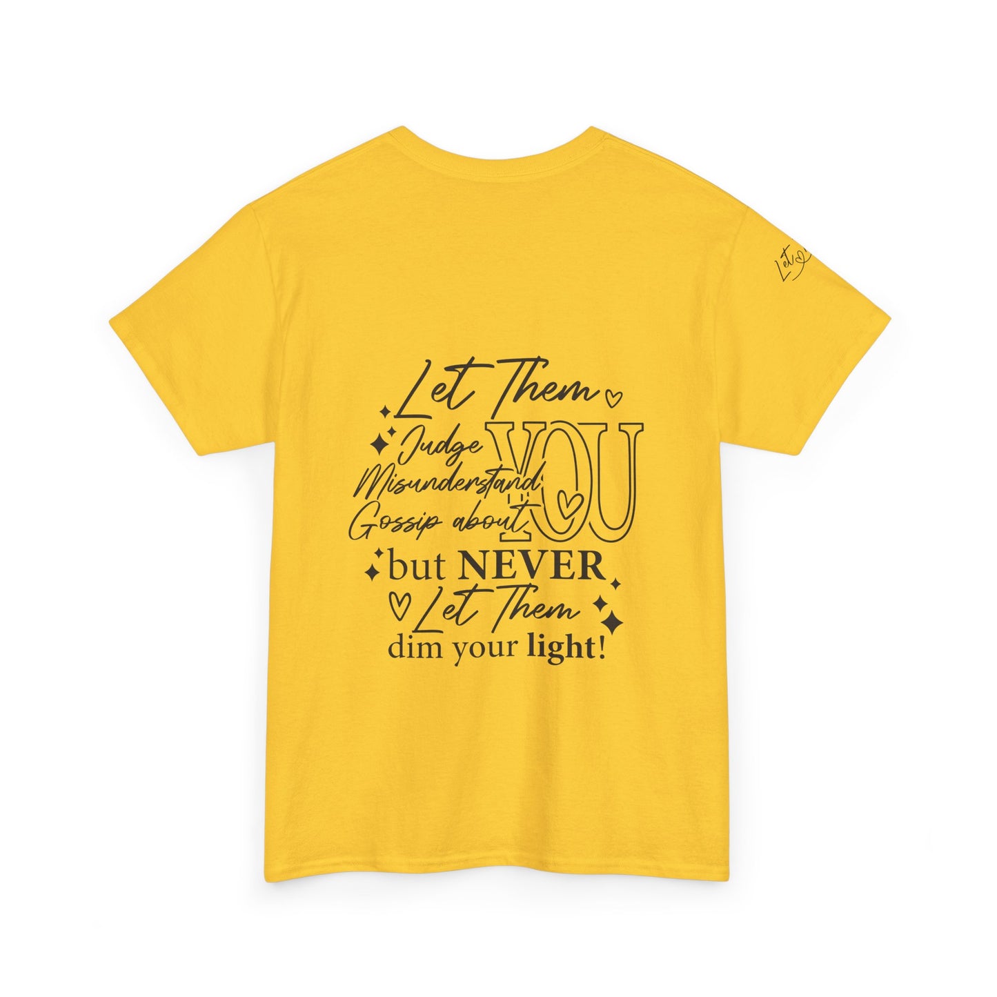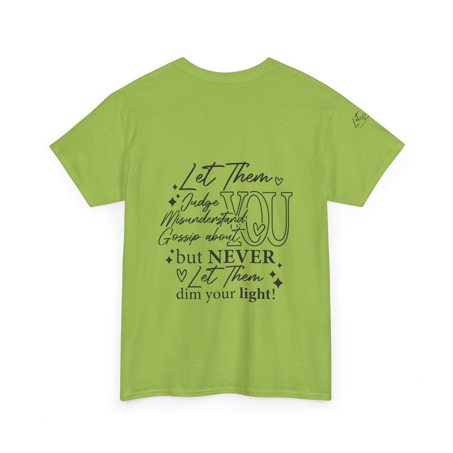 The "Let Them" tee is a cute and inspirational unisex heavy cotton tee featuring designs on the front, back, and right arm. This tee exudes a positive and uplifting vibe, making it perfect for everyday wear or as a thoughtful gift for someone special. Ideal for adults who appreciate unique and meaningful clothing pieces. Perfect for holidays, birthdays, and casual gatherings.