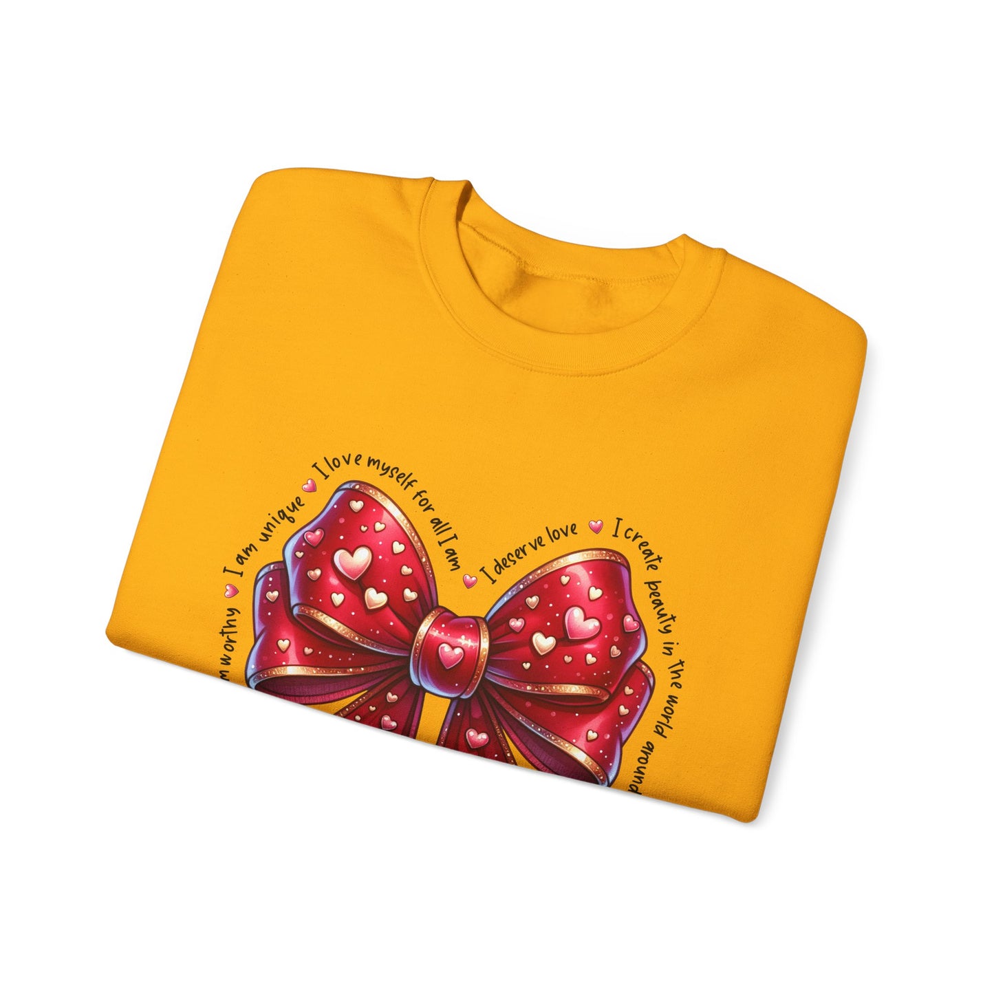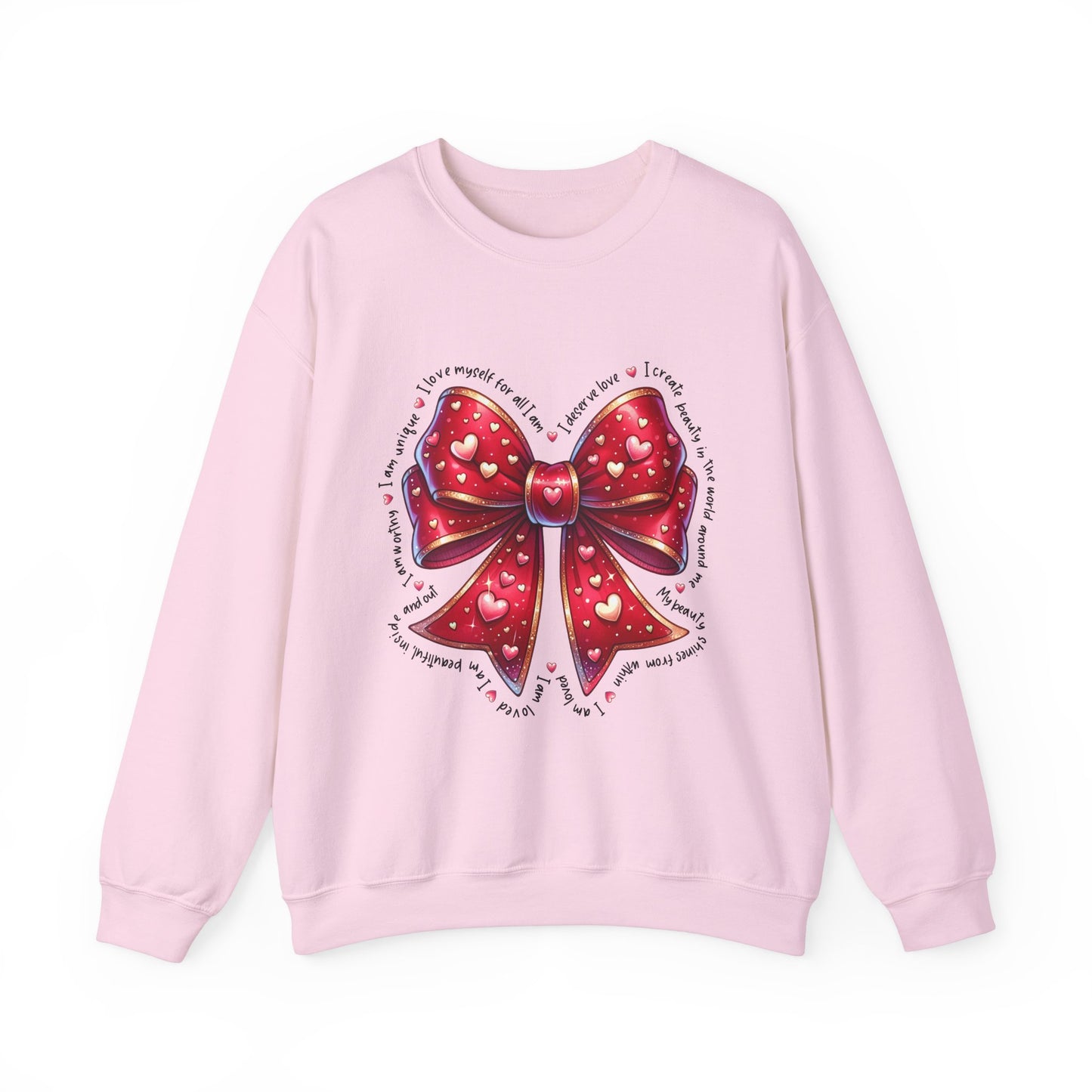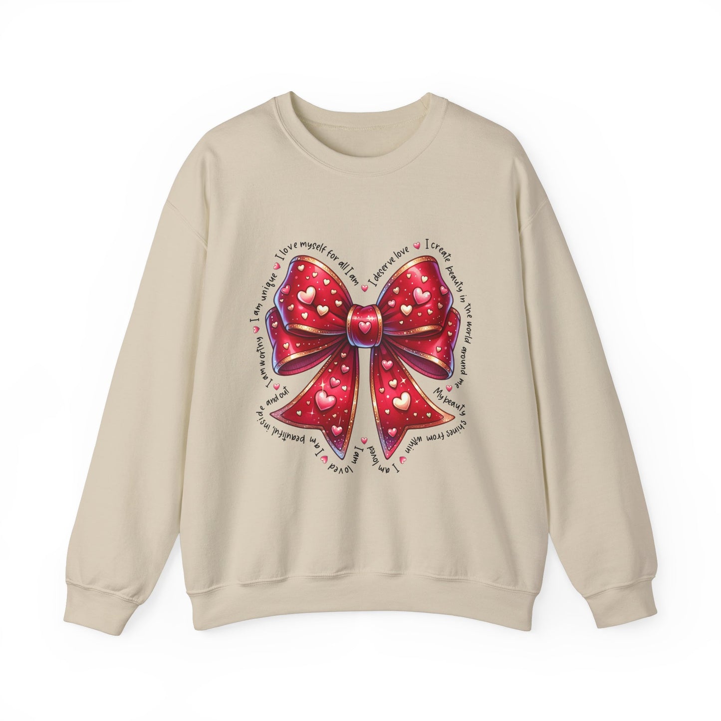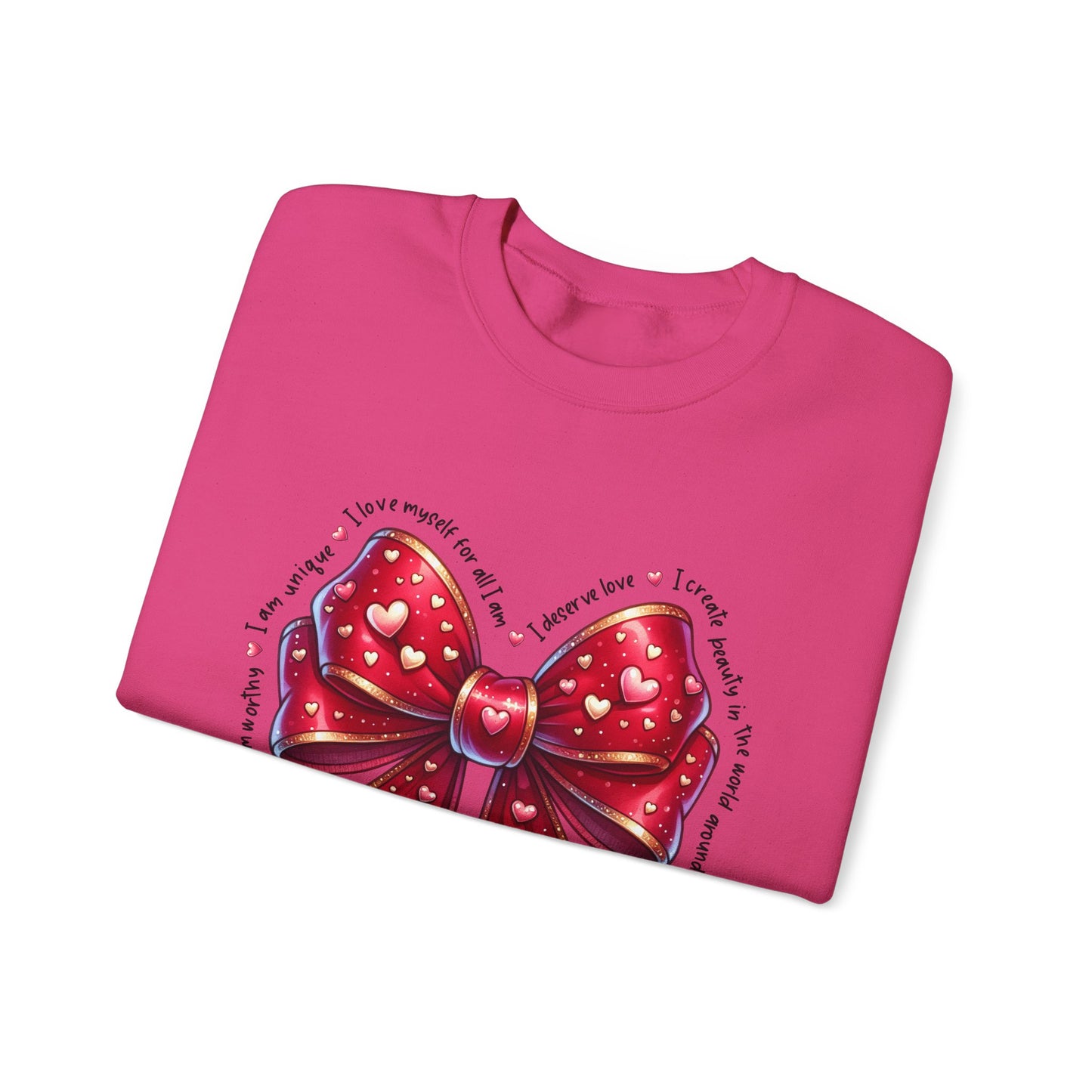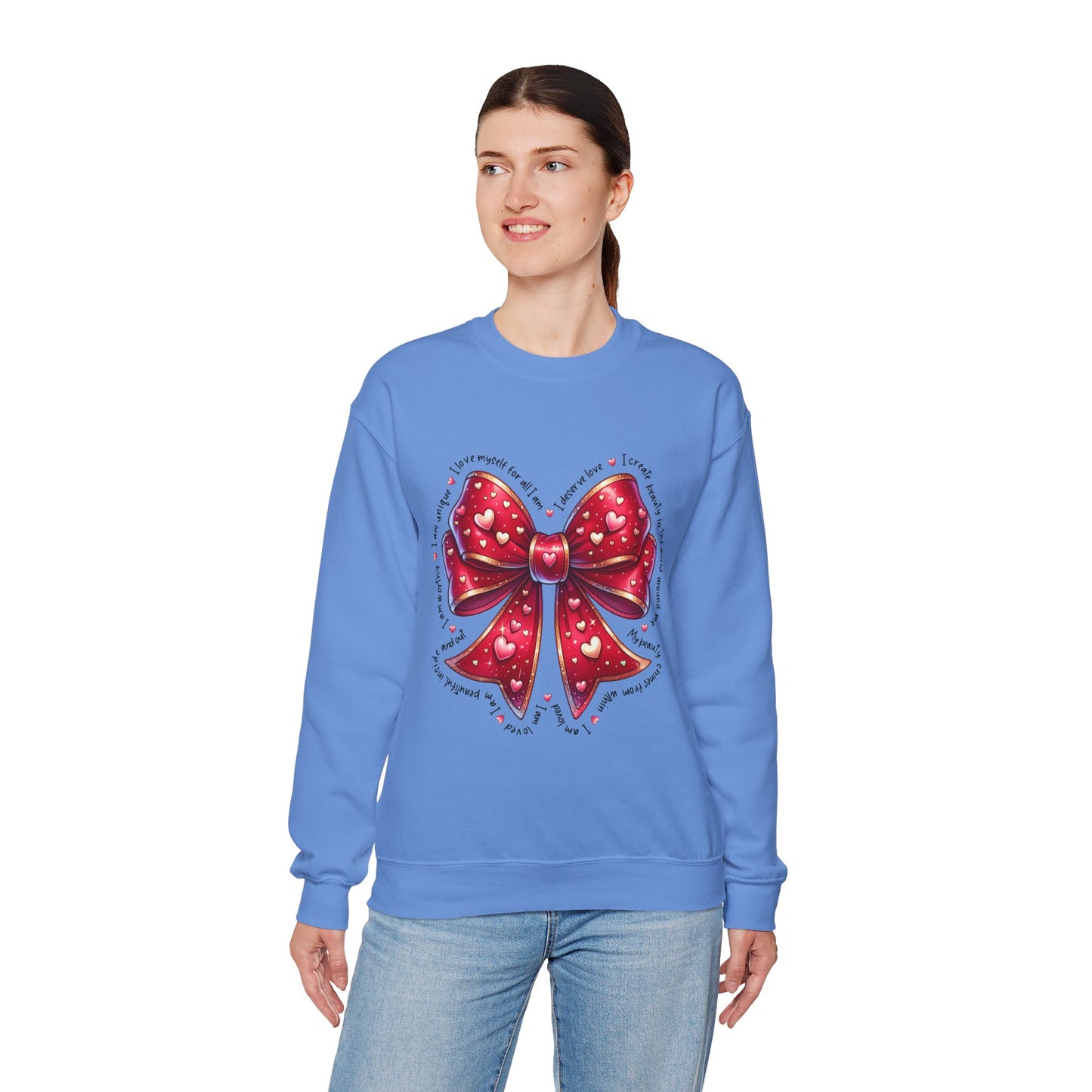 Bow Unisex Heavy Blend Sweatshirt with a red bow design, offering a warm, cozy, and comfy feel. Perfect for Valentine's Day or any cold weather occasion. Suitable for adults.