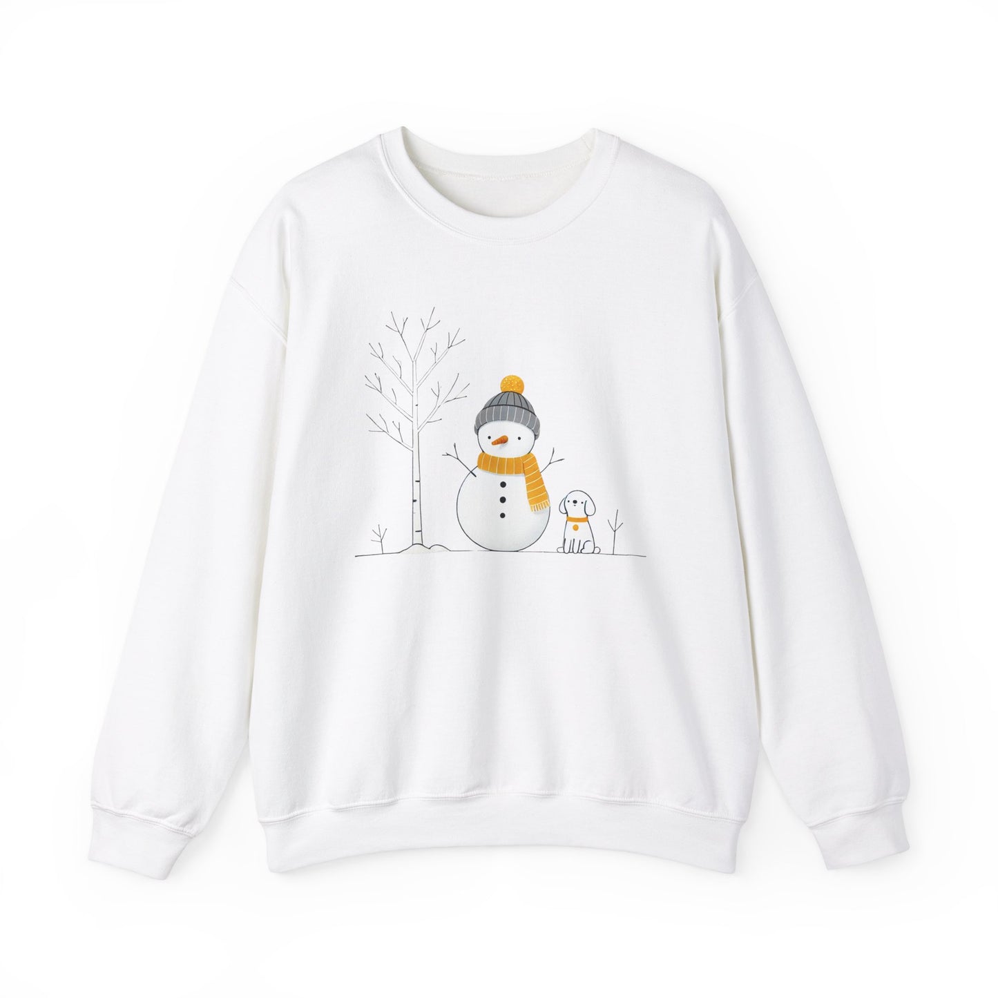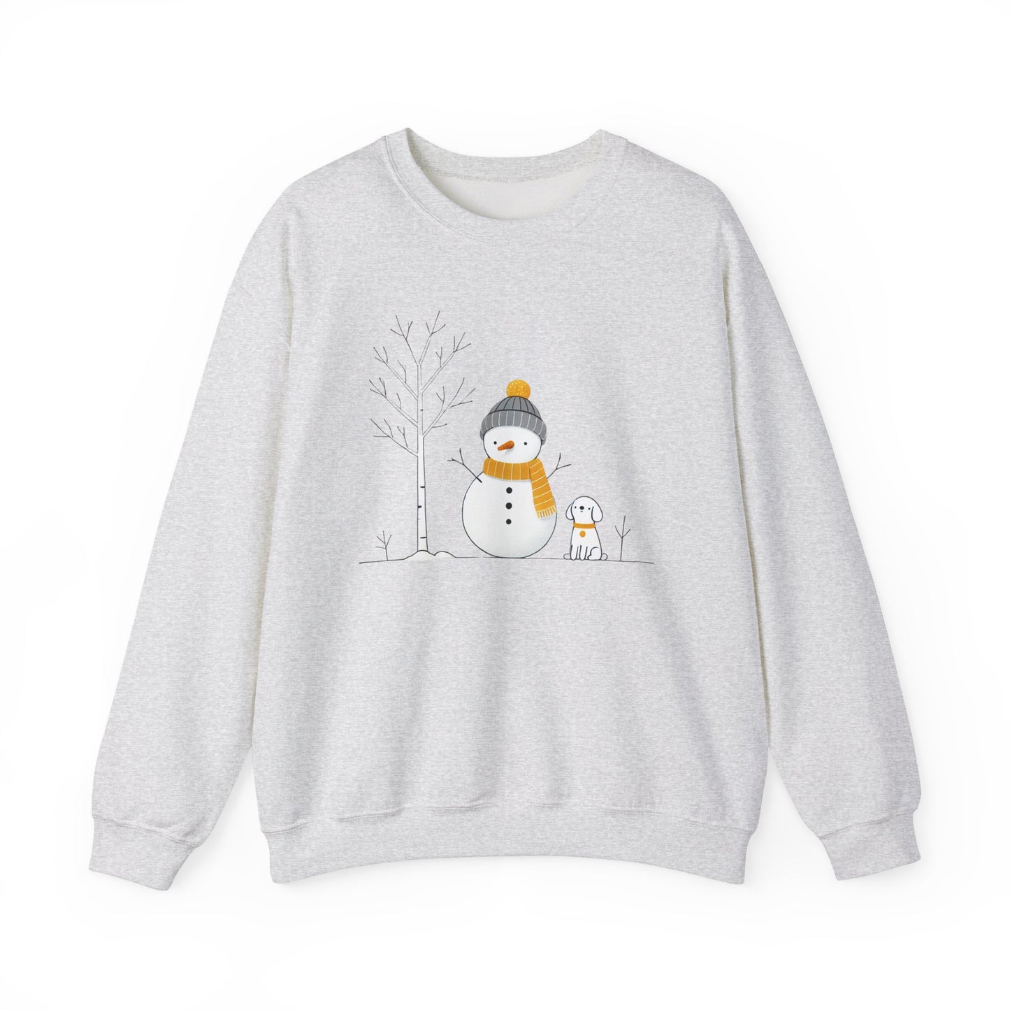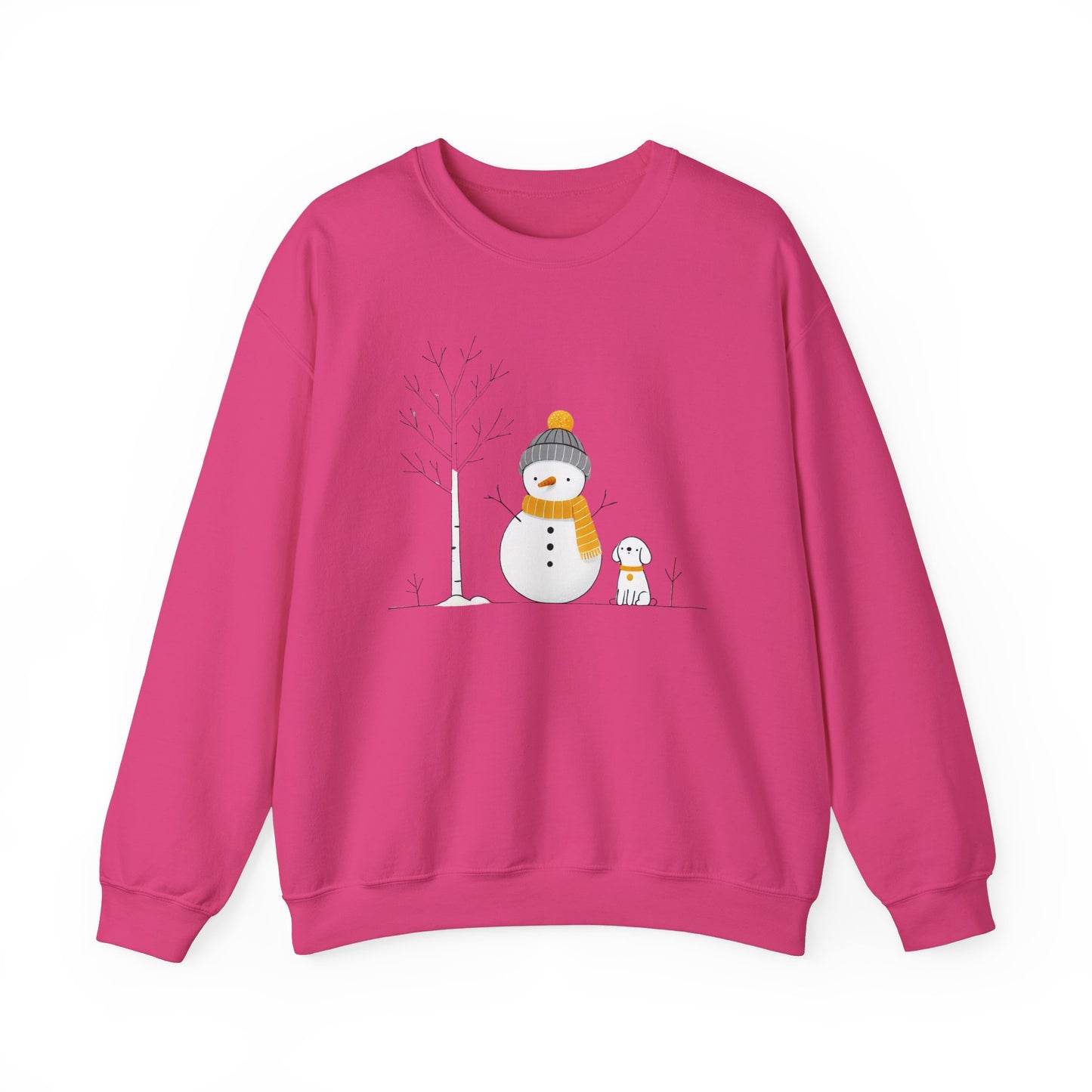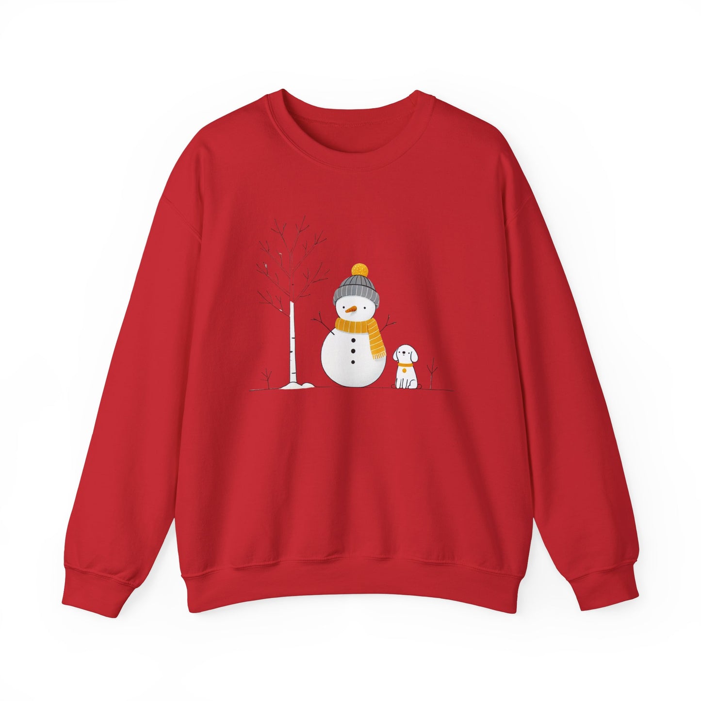 Snowman and dog winter scene sweatshirt that exudes a cozy and cute vibe, perfect for the winter season. Ideal for anyone looking for warmth and comfort during the colder months. Suitable for those who enjoy winter-themed clothing and want to stay cozy during holidays like Christmas and New Year's. Plus sizes available.