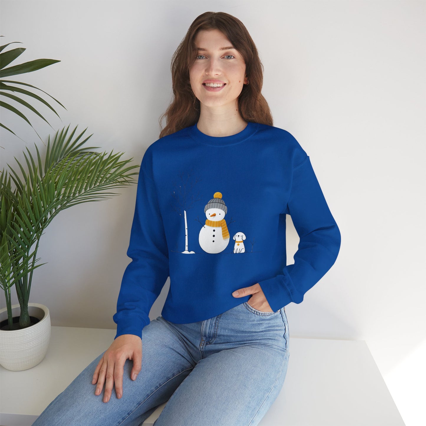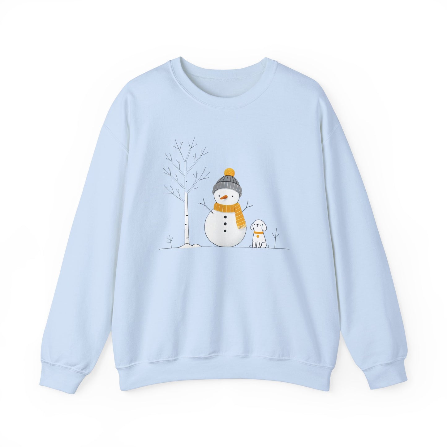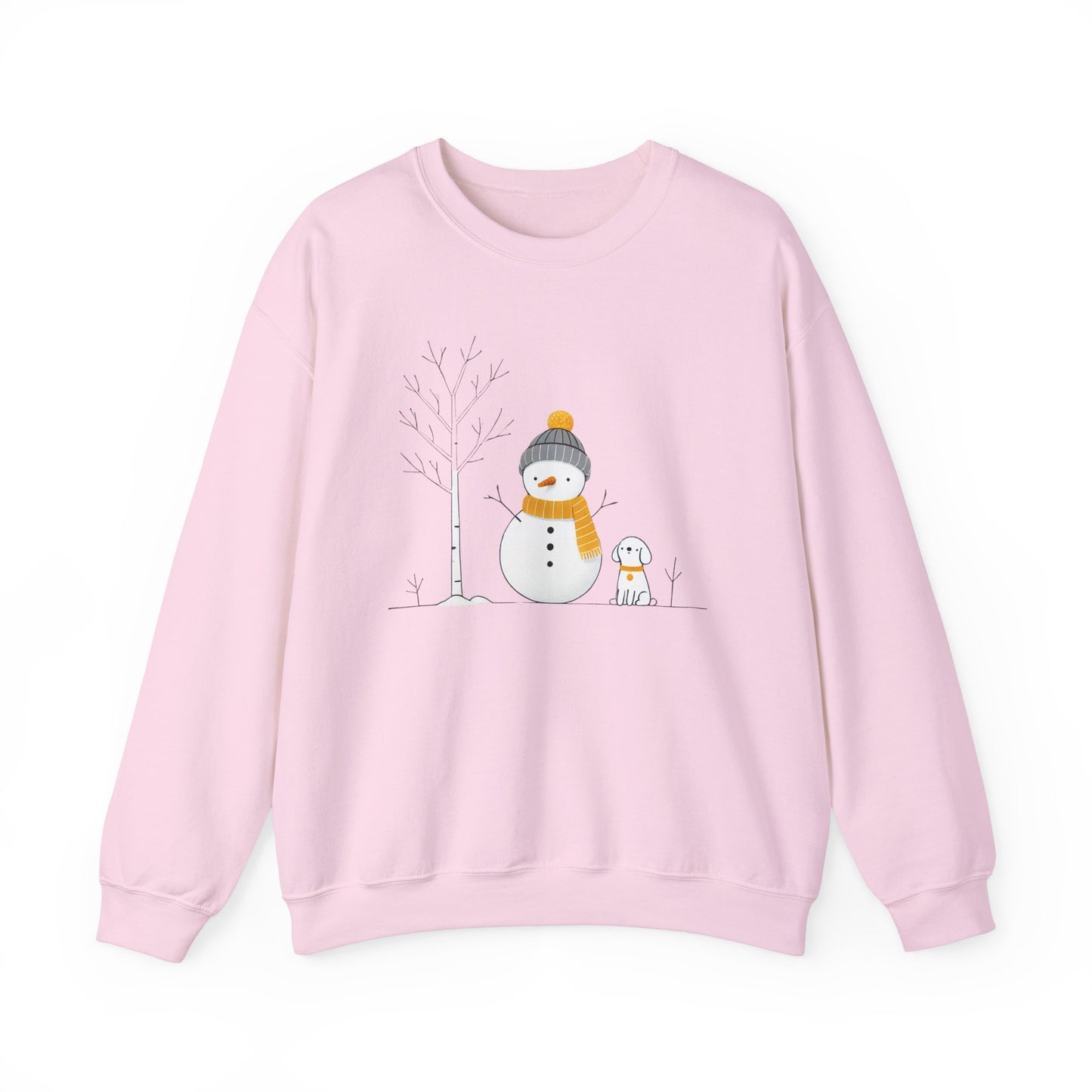 Snowman and dog winter scene sweatshirt that exudes a cozy and cute vibe, perfect for the winter season. Ideal for anyone looking for warmth and comfort during the colder months. Suitable for those who enjoy winter-themed clothing and want to stay cozy during holidays like Christmas and New Year's. Plus sizes available.