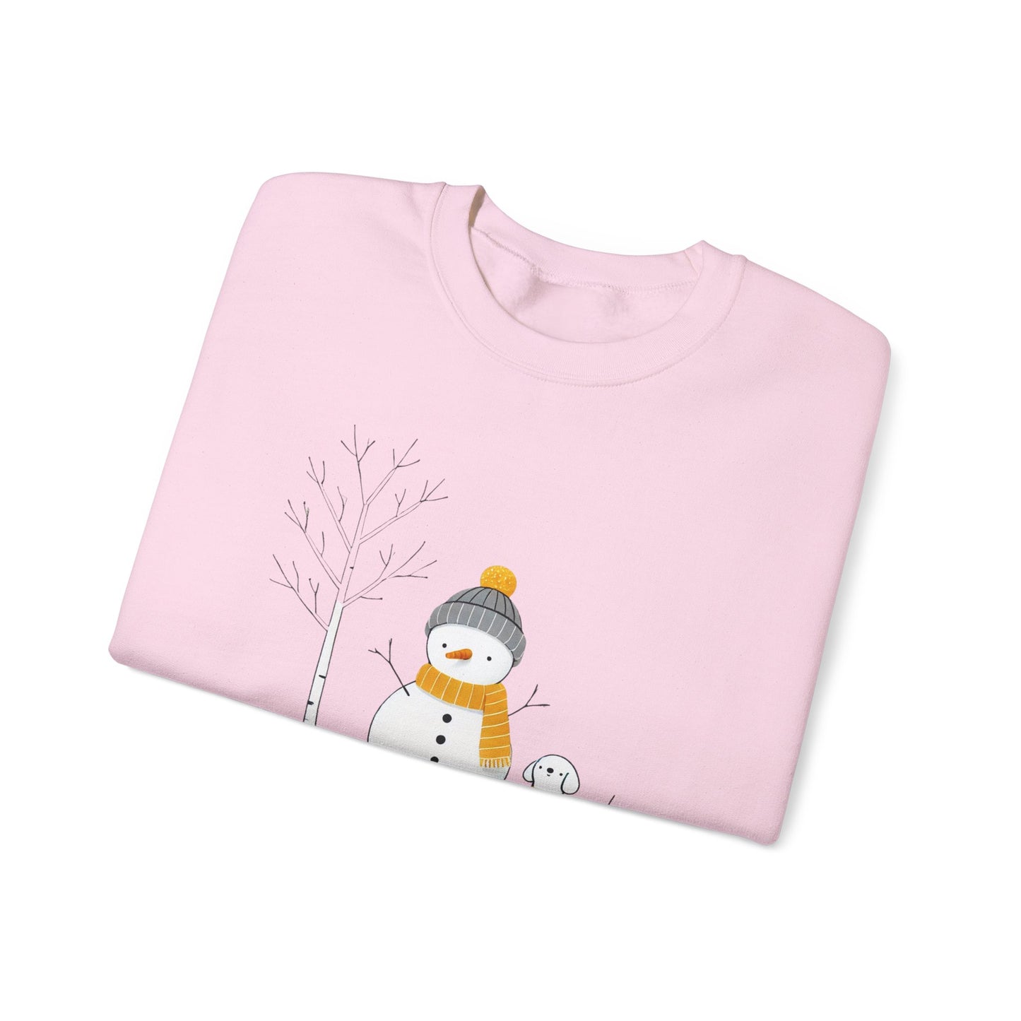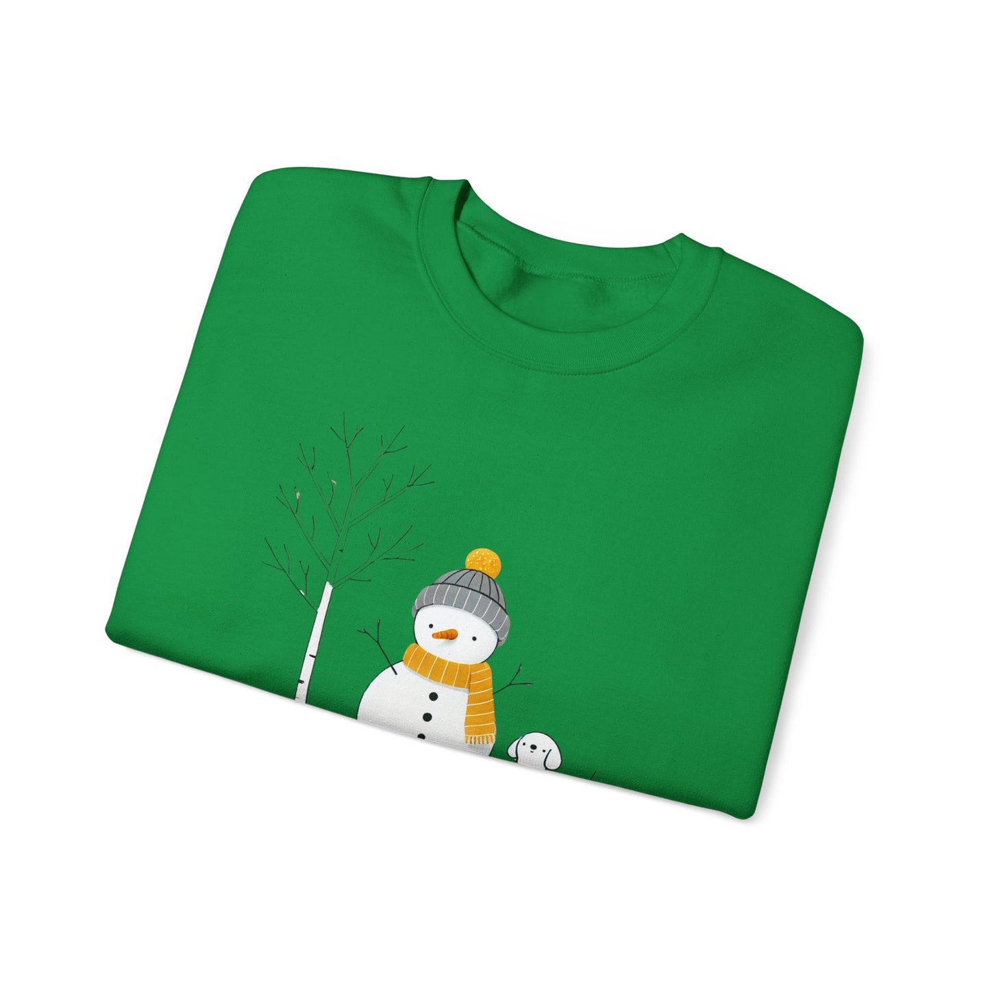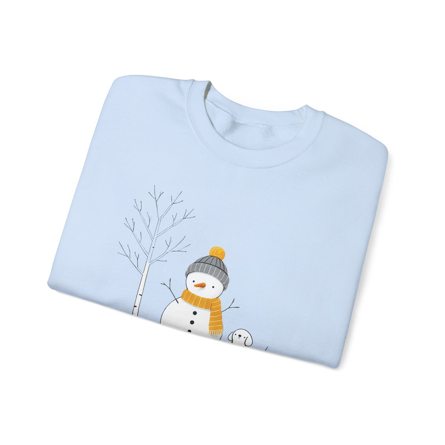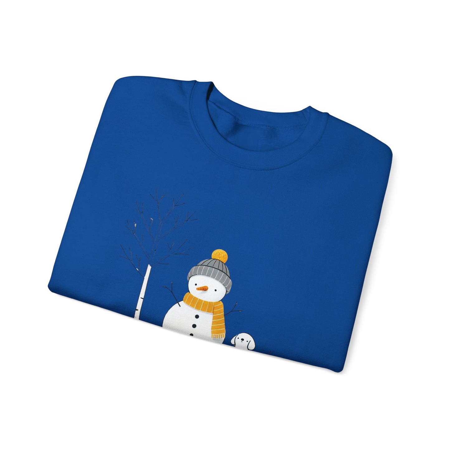 Snowman and dog winter scene sweatshirt that exudes a cozy and cute vibe, perfect for the winter season. Ideal for anyone looking for warmth and comfort during the colder months. Suitable for those who enjoy winter-themed clothing and want to stay cozy during holidays like Christmas and New Year's. Plus sizes available.