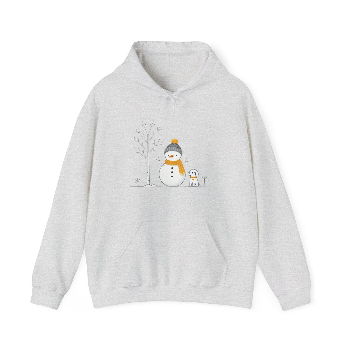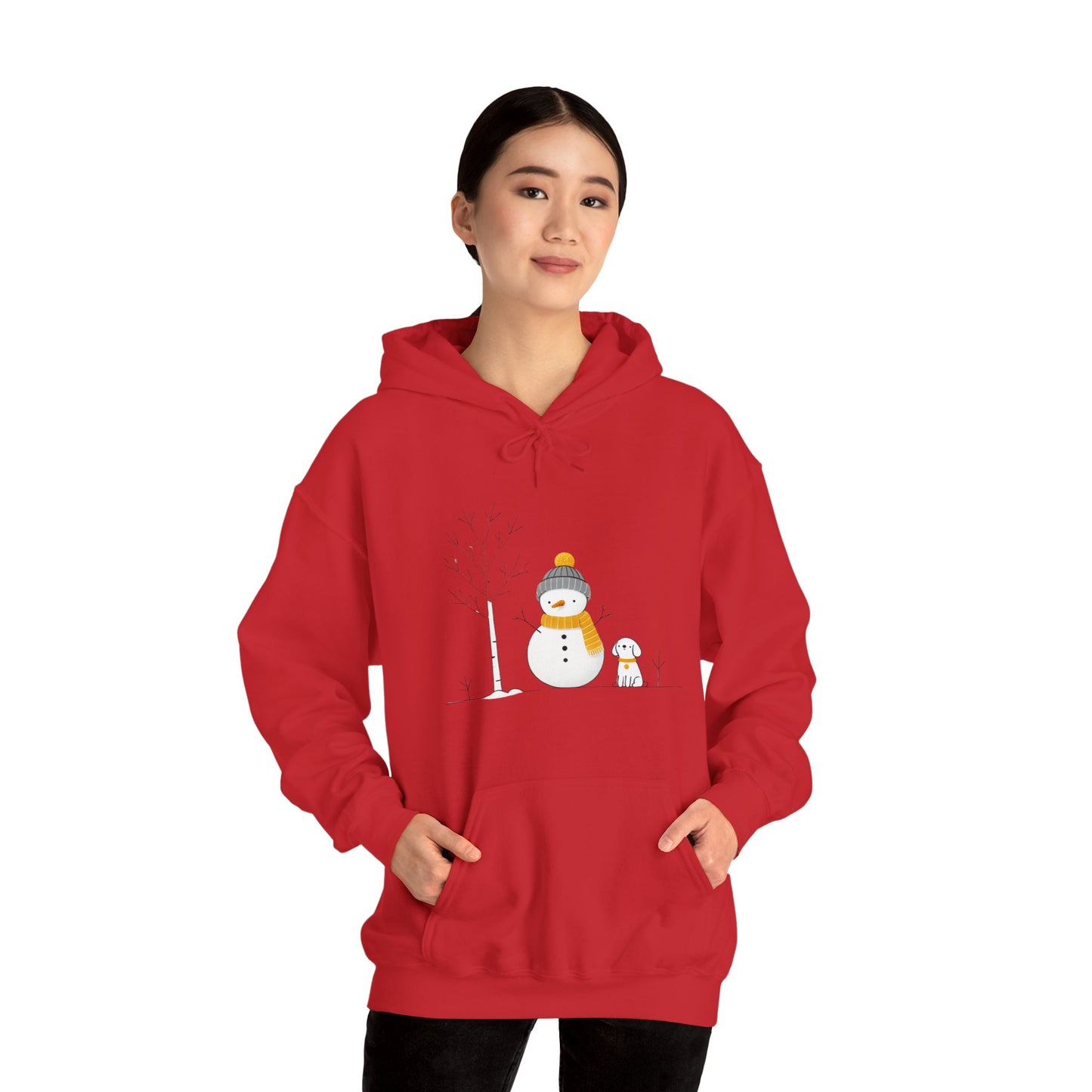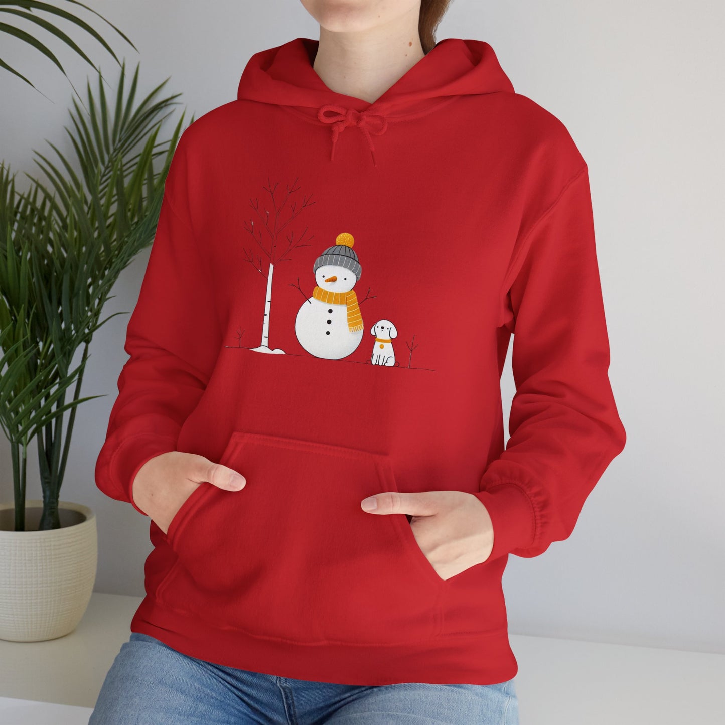 Snowman and Dog Winter Scene Hoodie, cute and wintery design perfect for staying cozy and warm during the cold season. Great for those who love winter, holidays, and festive vibes.