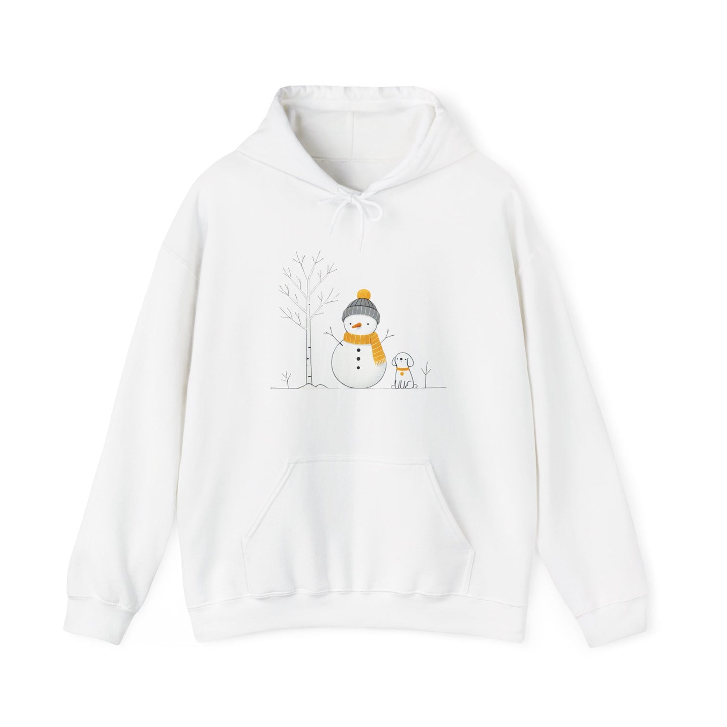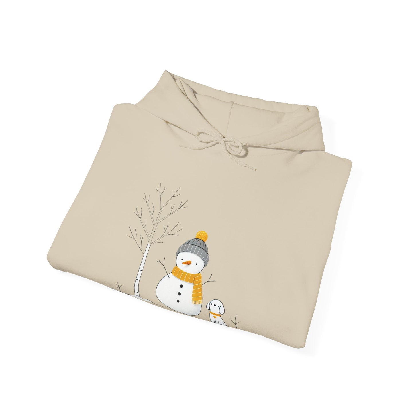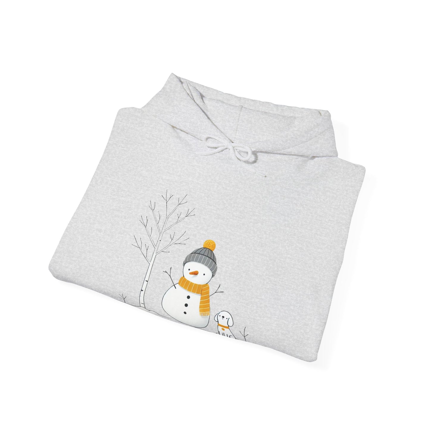 Snowman and Dog Winter Scene Hoodie, cute and wintery design perfect for staying cozy and warm during the cold season. Great for those who love winter, holidays, and festive vibes.