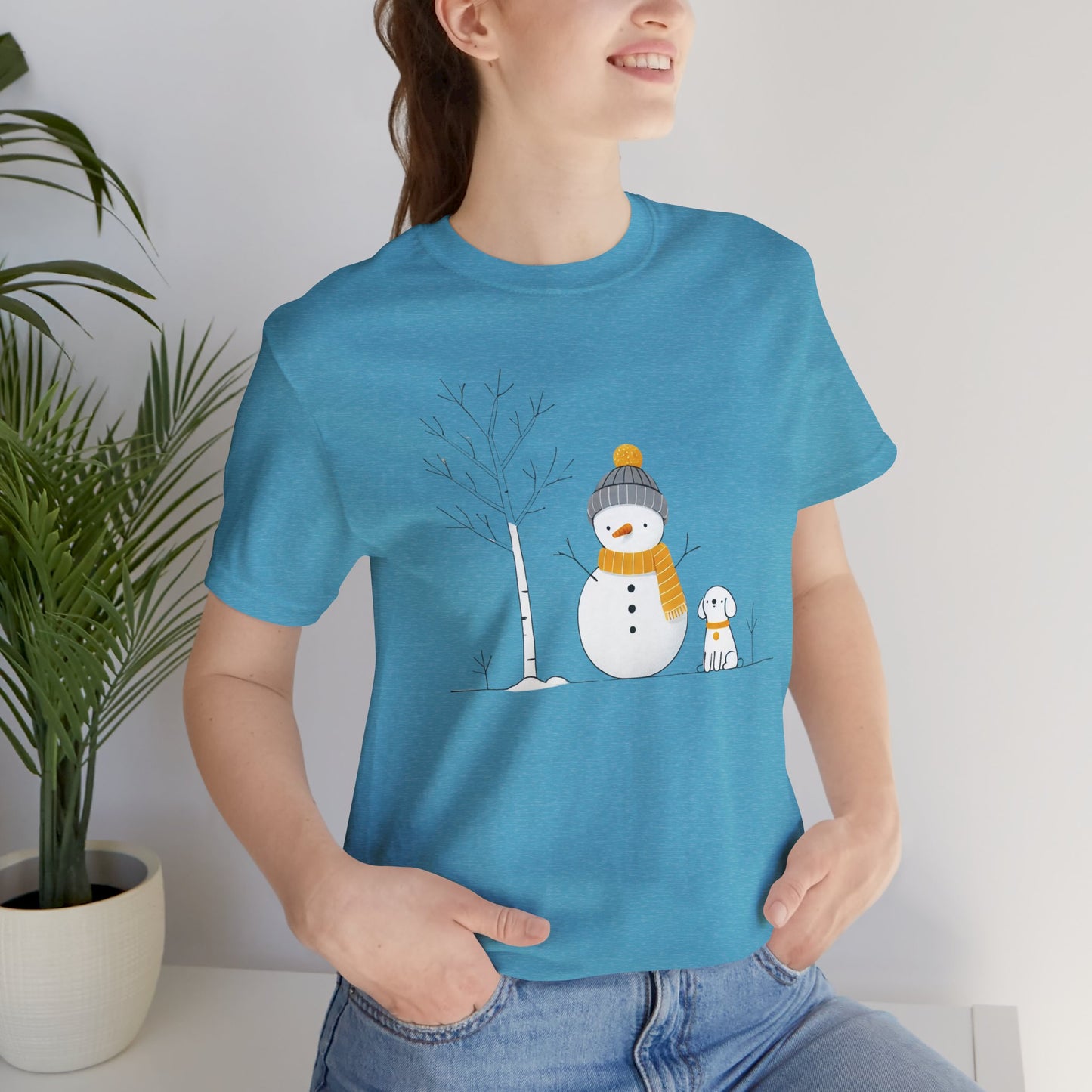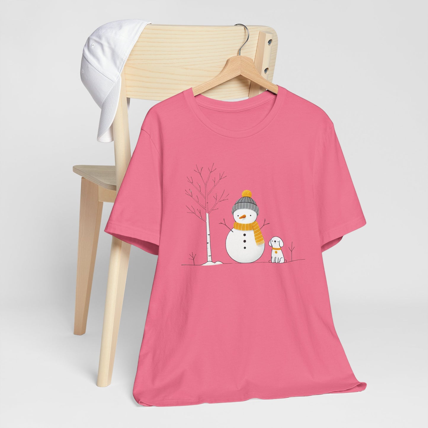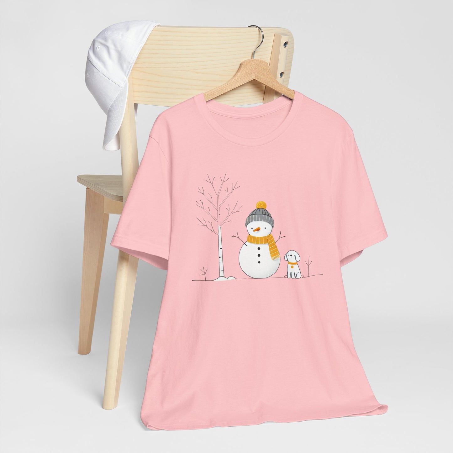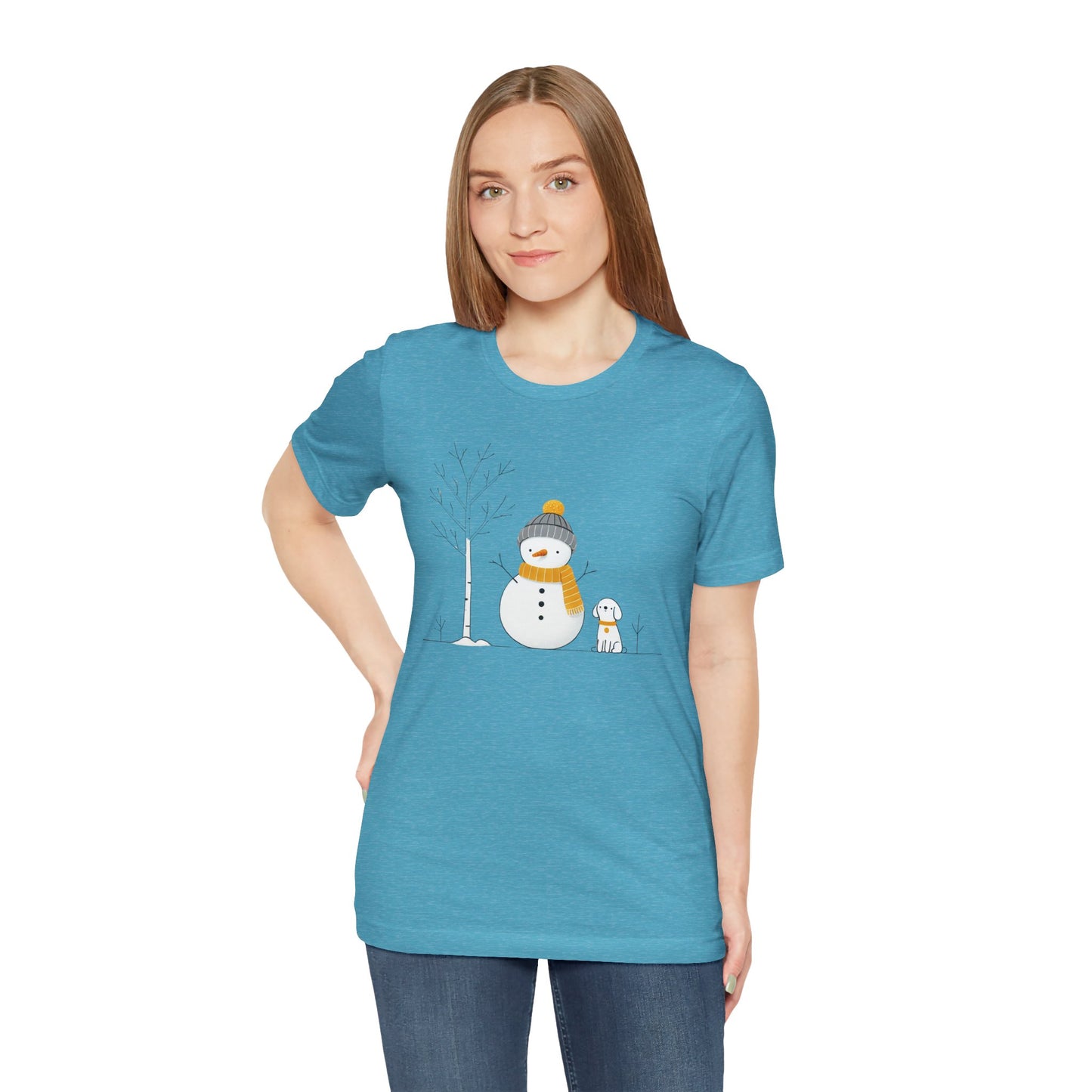 Stay cozy and cute with this Snowman and dog Unisex Jersey T-shirt. Perfect for winter days, this tee exudes a festive and playful vibe that is sure to brighten up your wardrobe. Ideal for those who love winter, dogs, and all things adorable, this tee is perfect for holiday gatherings, Christmas parties, and casual hangouts with friends.