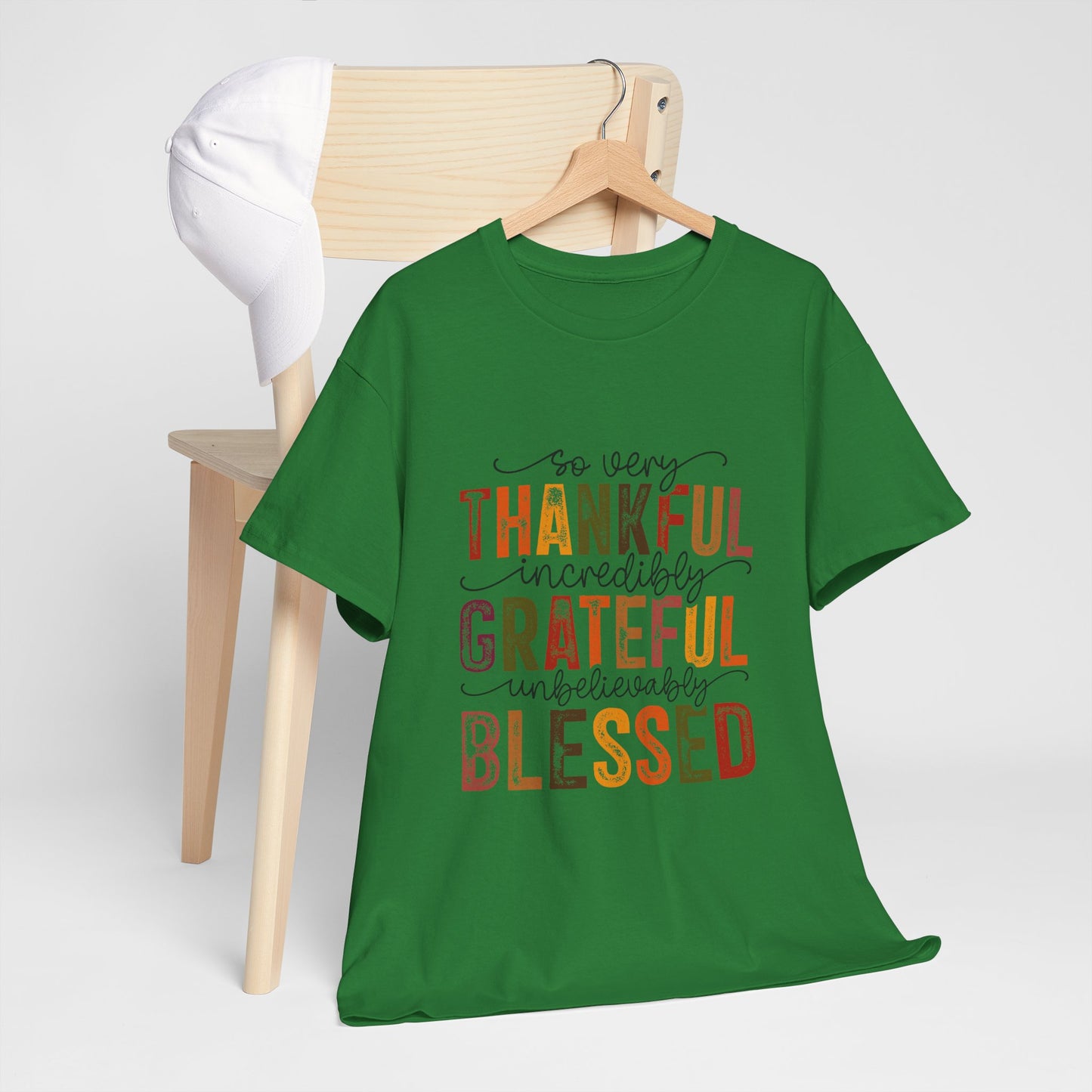 This Thankful Grateful Blessed Unisex Heavy Cotton T-Shirt is perfect for Thanksgiving and everyday wear. The distressed graphic design adds a vintage touch, giving off a cozy and warm vibe. It's a great choice for those who appreciate gratitude and positivity in their daily life.